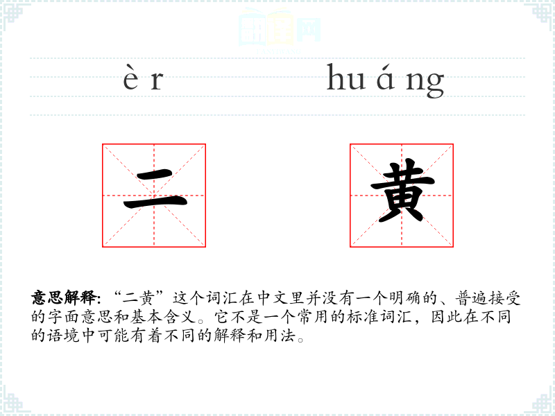 “二黄”这个词汇在中文里并没有一个明确的、普遍接受的字面意思和基本含义。它不是一个常用的标准词汇,因此在不同的语境中可能有着不同的解释和用法。
