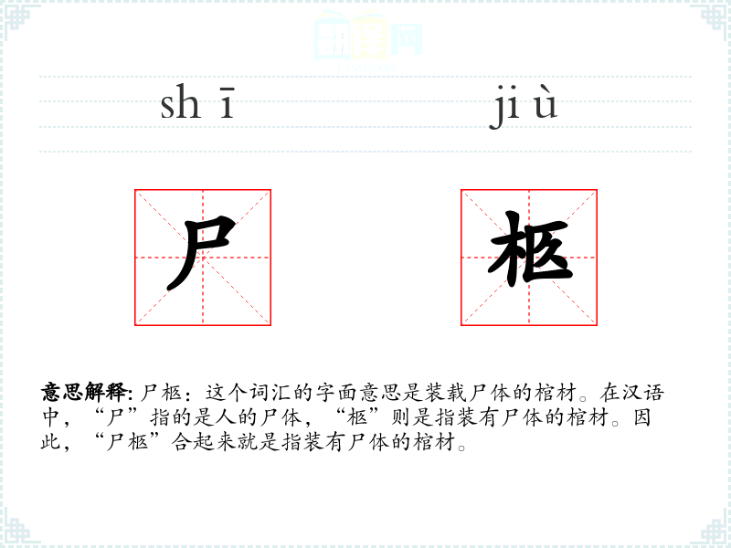 尸柩:这个词汇的字面意思是装载尸体的棺材。在汉语中,“尸”指的是人的尸体,“柩”则是指装有尸体的棺材。因此,“尸柩”合起来就是指装有尸体的棺材。