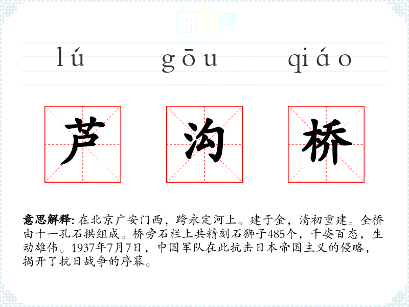 1.在北京广安门西,跨永定河上。建于金,清初重建。全桥由十一孔石拱组成。桥旁石栏上共精刻石狮子485个,千姿百态,生动雄伟。1937年7月7日,中国军队在此抗击日本帝国主义的侵略,揭开了抗日战争的序幕。