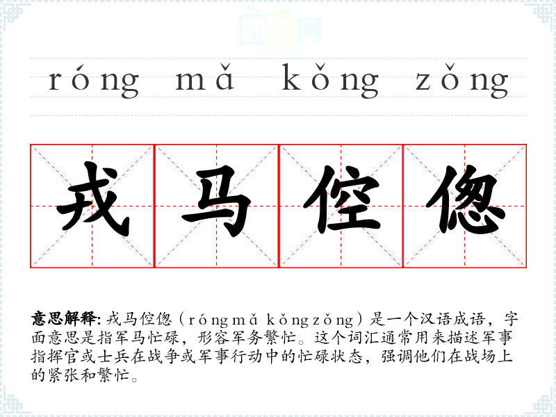 戎马倥偬(róng mǎ kǒng zǒng)是一个汉语成语,字面意思是指军马忙碌,形容军务繁忙。这个词汇通常用来描述军事指挥官或士兵在战争或军事行动中的忙碌状态,强调他们在战场上的紧张和繁忙。