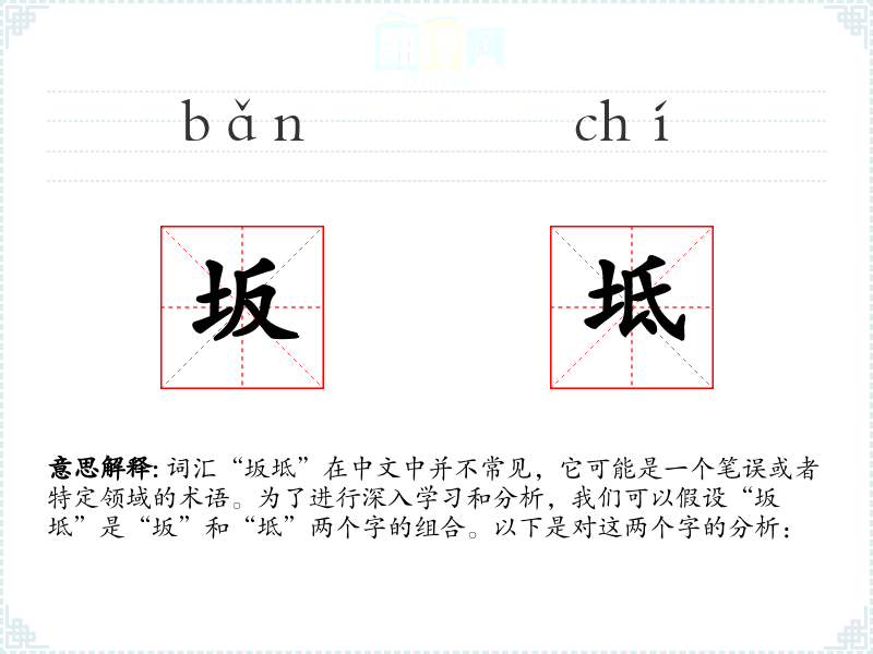 词汇“坂坻”在中文中并不常见,它可能是一个笔误或者特定领域的术语。为了进行深入学习和分析,我们可以假设“坂坻”是“坂”和“坻”两个字的组合。以下是对这两个字的分析: