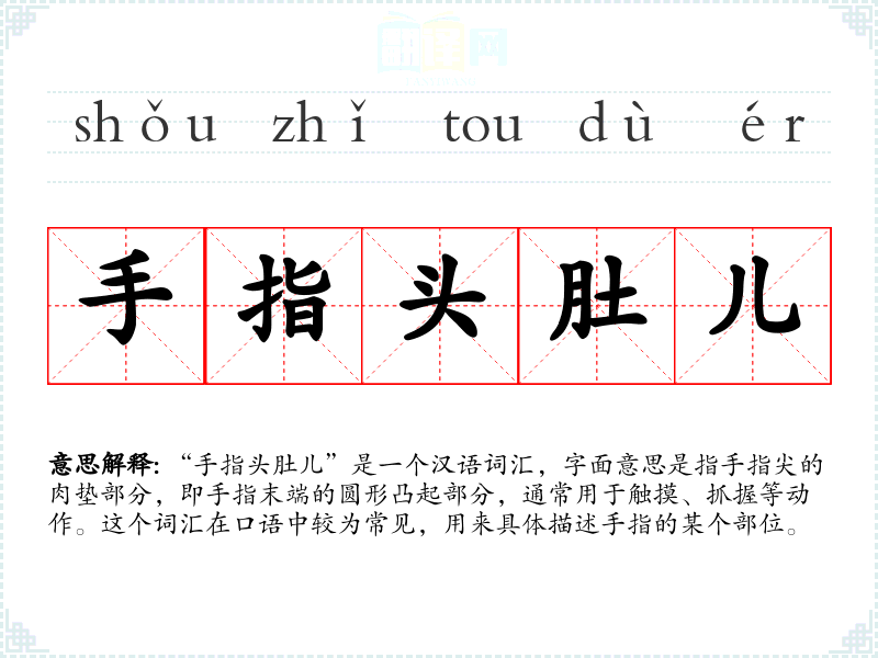 “手指头肚儿”这个词汇在汉语中较为口语化,其词源较为简单,主要是由“手指”和“头肚儿”两个部分组成。在语言的演变中,这个词汇保持了其基本含义,没有发生太大的变化。