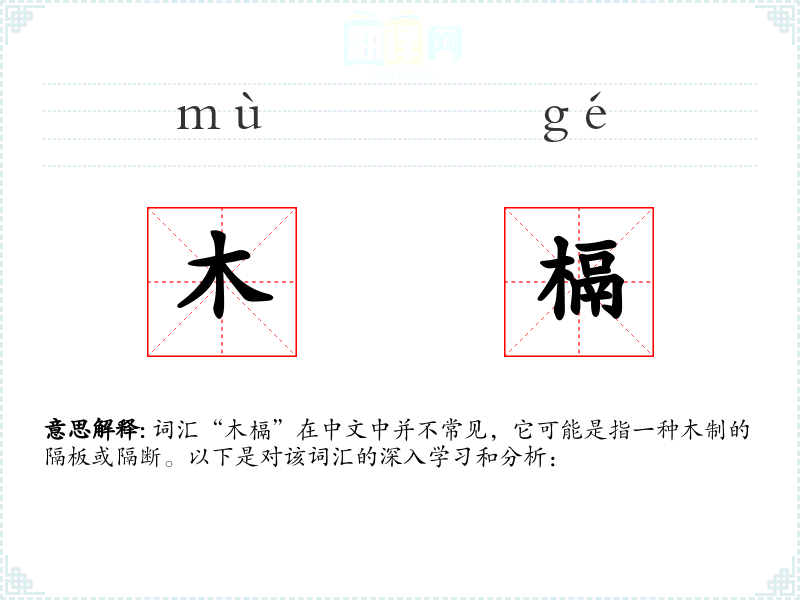 词汇“木槅”在中文中并不常见,它可能是指一种木制的隔板或隔断。以下是对该词汇的深入学*和分析: