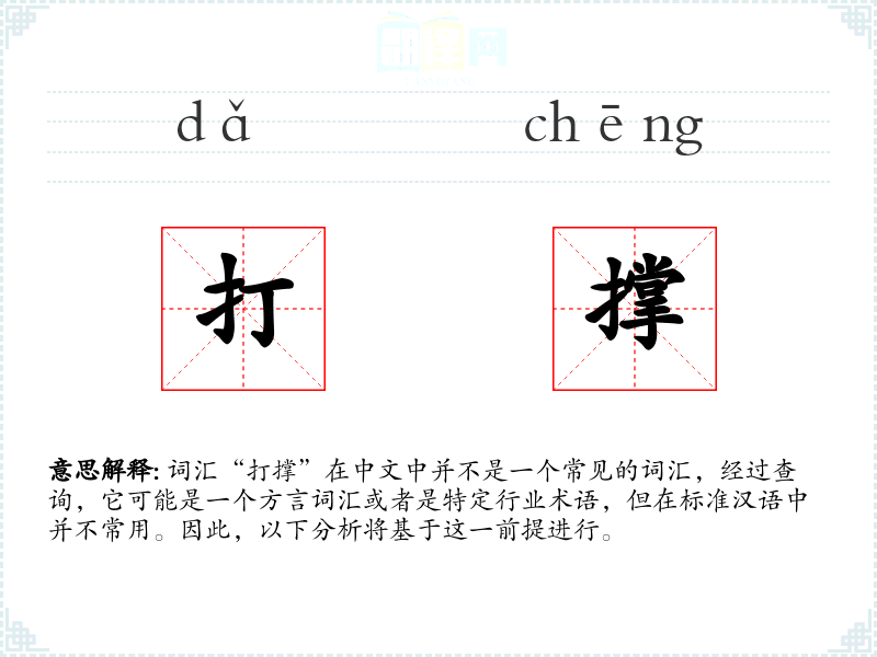 词汇“打撑”在中文中并不是一个常见的词汇,经过查询,它可能是一个方言词汇或者是特定行业术语,但在标准汉语中并不常用。因此,以下分析将基于这一前提进行。