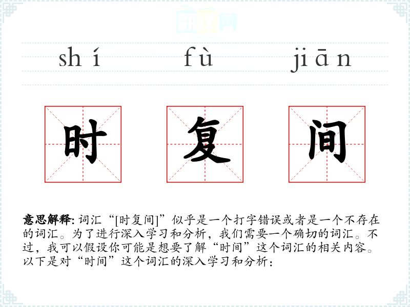 词汇“[时复间]”似乎是一个打字错误或者是一个不存在的词汇。为了进行深入学和分析,我们需要一个确切的词汇。不过,我可以假设你可能是想要了解“时间”这个词汇的相关内容。以下是对“时间”这个词汇的深入学和分析: