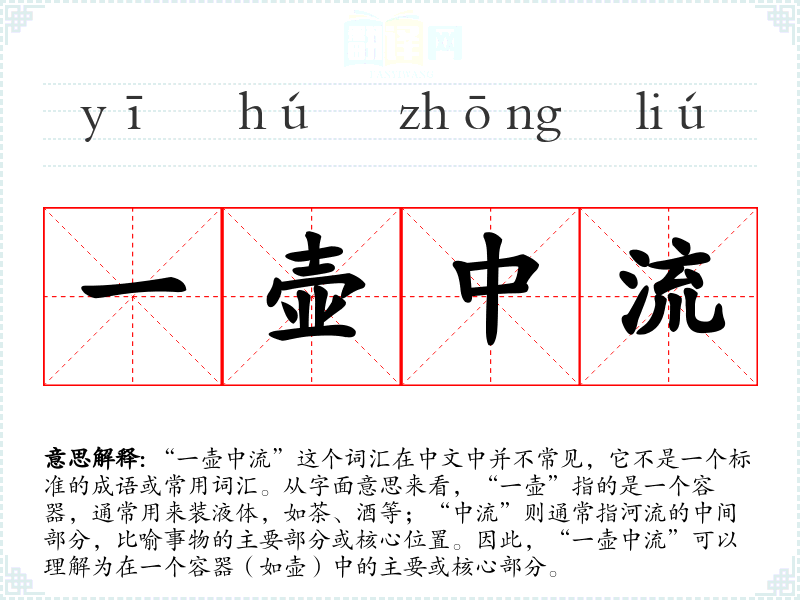 在**文化中,“壶”常常与茶文化联系在一起,象征着宁静和深思。而“中流”则常常用来比喻事物的核心或重要部分。因此,“一壶中流”可能在强调某种文化或思想的核心价值时被使用。