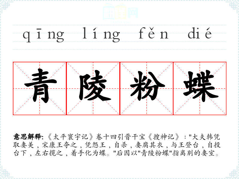 《太平寰宇记》卷十四引晋干宝《搜神记》﹕"大夫韩凭取妻美﹐宋康王夺之﹐凭怨王﹐自杀﹐妻腐其衣﹐与王登台﹐自投台下﹐左右揽之﹐着手化为蝶。"后因以"青陵粉蝶"指离别的妻室。