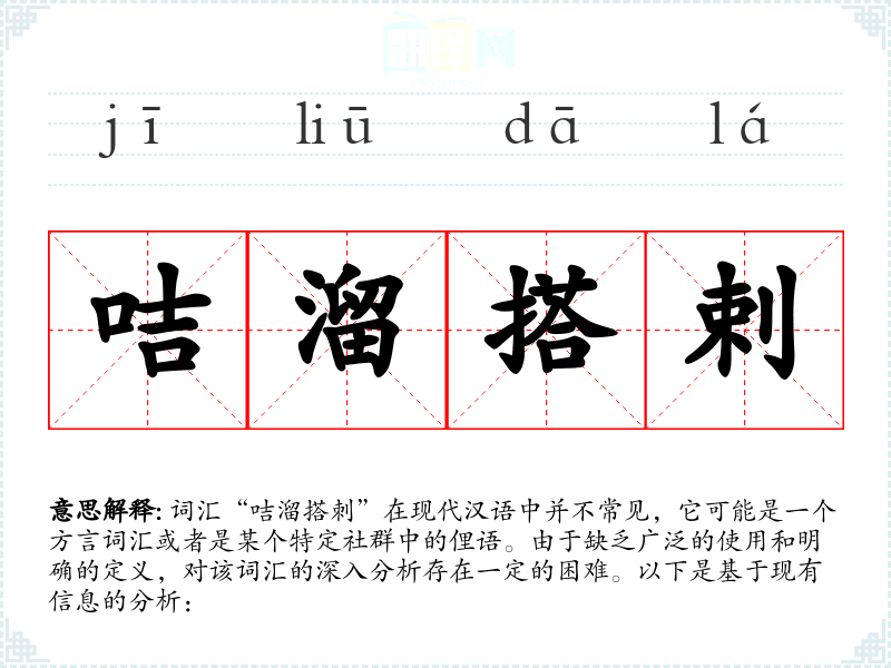 由于“咭溜搭刺”不是一个标准汉语词汇,其字面意思和基本含义难以确定。它可能是由几个音节组成的拟声词,用来描述某种声音或动作。