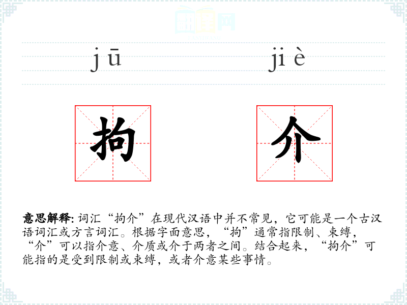 - 理解:拘介这个词在现代汉语中不常见,但在某些特定的语境和文化背景中仍有其独特的意义和用法。