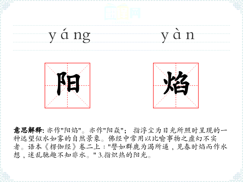 1.亦作"阳焰"。亦作"阳焱"; 指浮尘为日光所照时呈现的一种远望似水如雾的自然景象。佛经中常用以比喻事物之虚幻不实者。语本《楞伽经》卷二上﹕"譬如群鹿为渴所逼﹐见春时焰而作水想﹐迷乱驰趣不知非水。" 3.指炽热的阳光。