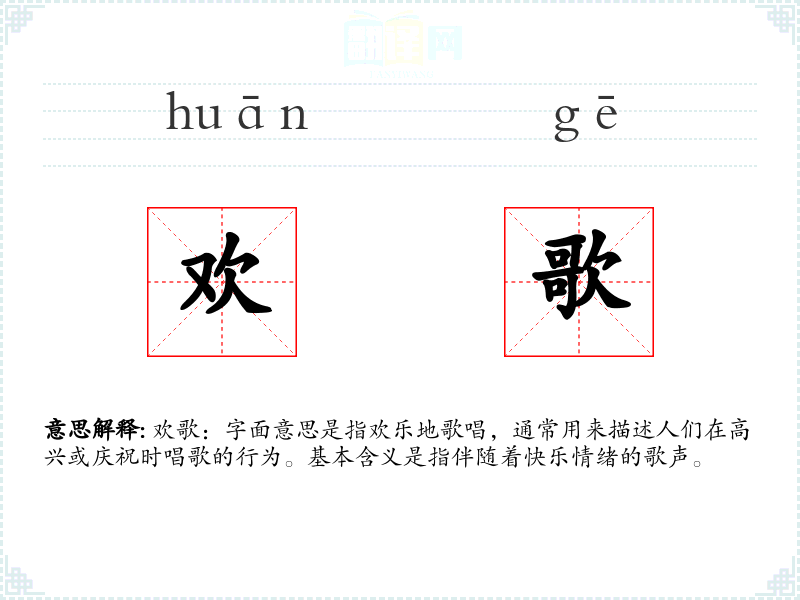欢歌:字面意思是指欢乐地歌唱,通常用来描述人们在高兴或庆祝时唱歌的行为。基本含义是指伴随着快乐情绪的歌声。