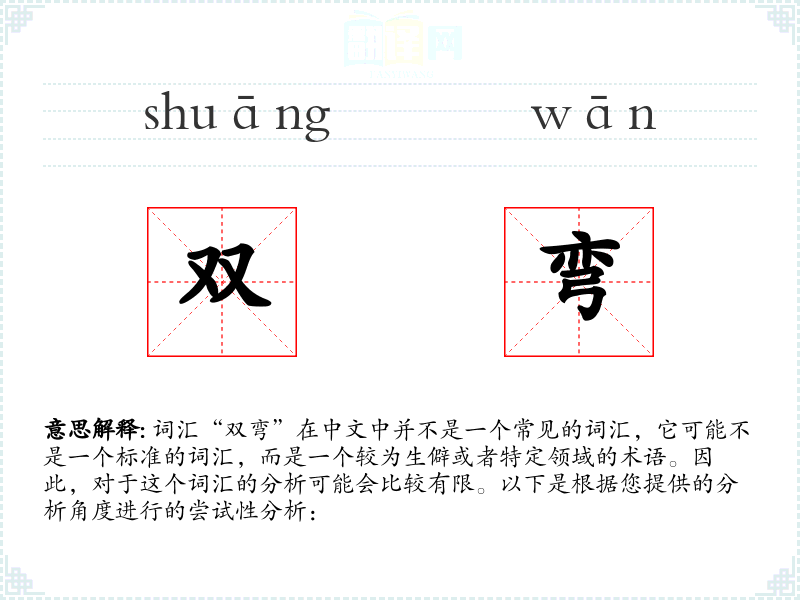 词汇“双弯”在中文中并不是一个常见的词汇,它可能不是一个标准的词汇,而是一个较为生僻或者特定领域的术语。因此,对于这个词汇的分析可能会比较有限。以下是根据您提供的分析角度进行的尝试性分析: