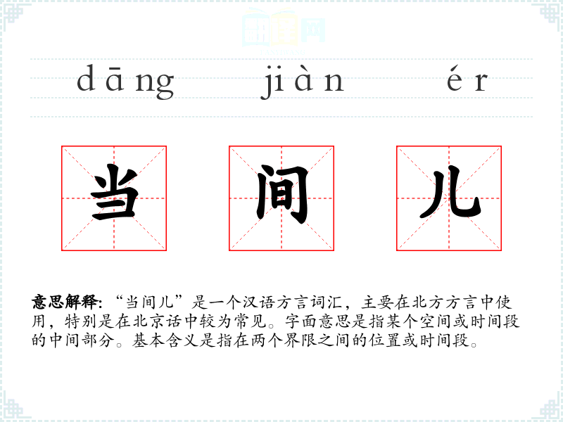 “当间儿”的词源较为模糊,可能是由“当”和“间儿”两个词组合而成。在北方方言中,“间儿”常用来表示空间或时间的小段,而“当”则有处于某处的意思。随着时间的推移,这个词在北方方言中逐渐固定下来。
