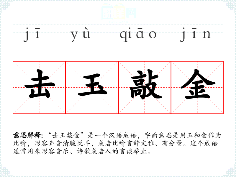 “击玉敲金”这个成语不仅丰富了汉语的表达,也体现了*文化对美的追求和对高雅言辞的推崇。在学语言和表达时,理解和运用这样的成语能够提升语言的韵味和表达的深度。