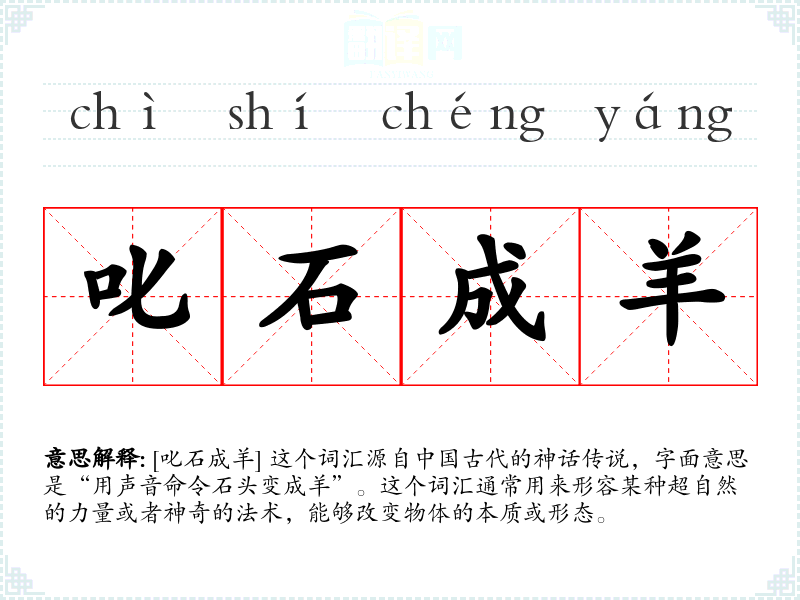 [叱石成羊] 这个词汇源自**古代的神话传说,字面意思是“用声音命令石头变成羊”。这个词汇通常用来形容某种超自然的力量或者神奇的法术,能够改变物体的本质或形态。