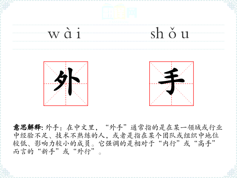 外手:在中文里,“外手”通常指的是在某一领域或行业中经验不足、技术不熟练的人,或者是指在某个团队或组织中地位较低、影响力较小的成员。它强调的是相对于“内行”或“高手”而言的“新手”或“外行”。
