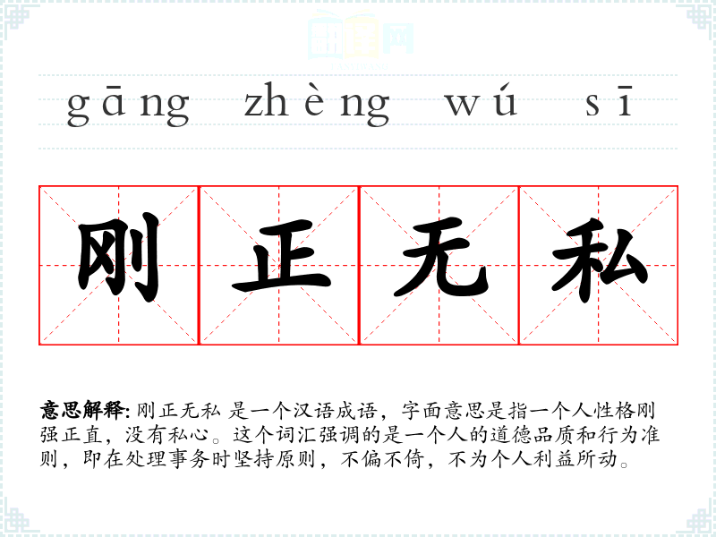 刚正无私 是一个汉语成语,字面意思是指一个人性格刚强正直,没有私心。这个词汇强调的是一个人的道德品质和行为准则,即在处理事务时坚持原则,不偏不倚,不为个人利益所动。
