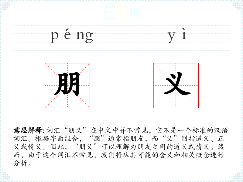 词汇“朋义”在中文中并不常见,它不是一个标准的汉语词汇。根据字面组合,“朋”通常指朋友,而“义”则指道义、正义或情义。因此,“朋义”可以理解为朋友之间的道义或情义。然而,由于这个词汇不常见,我们将从其可能的含义和相关概念进行分析。