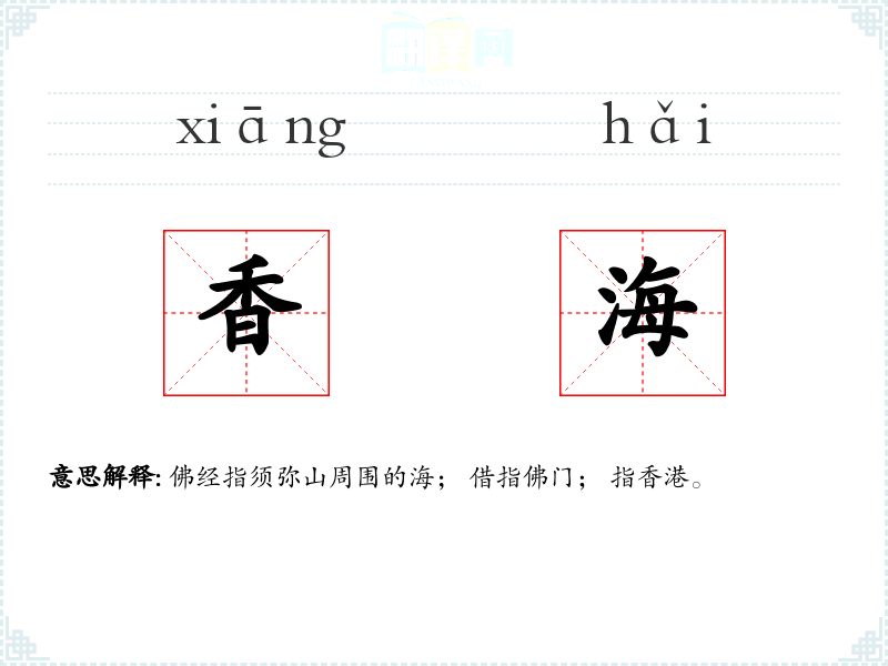 佛经指须弥山周围的海; 借指佛门; 指香港。