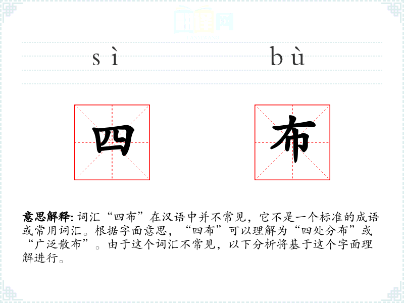 词汇“四布”在汉语中并不常见,它不是一个标准的成语或常用词汇。根据字面意思,“四布”可以理解为“四处分布”或“广泛散布”。由于这个词汇不常见,以下分析将基于这个字面理解进行。