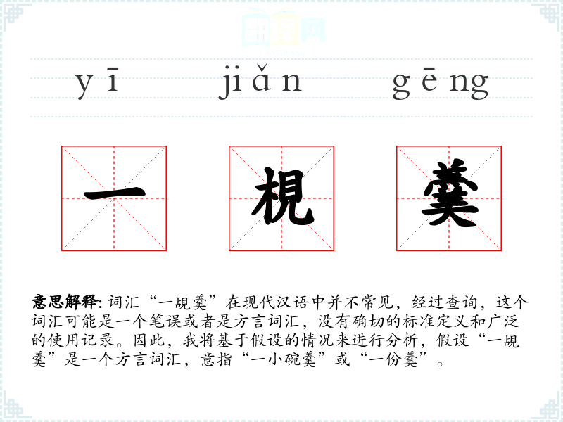 词汇“一覘羹”在现代汉语中并不常见,经过查询,这个词汇可能是一个笔误或者是方言词汇,没有确切的标准定义和广泛的使用记录。因此,我将基于假设的情况来进行分析,假设“一覘羹”是一个方言词汇,意指“一小碗羹”或“一份羹”。