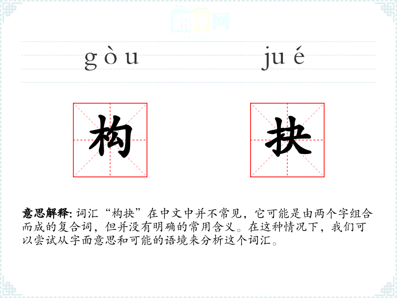 词汇“构抉”在中文中并不常见,它可能是由两个字组合而成的复合词,但并没有明确的常用含义。在这种情况下,我们可以尝试从字面意思和可能的语境来分析这个词汇。