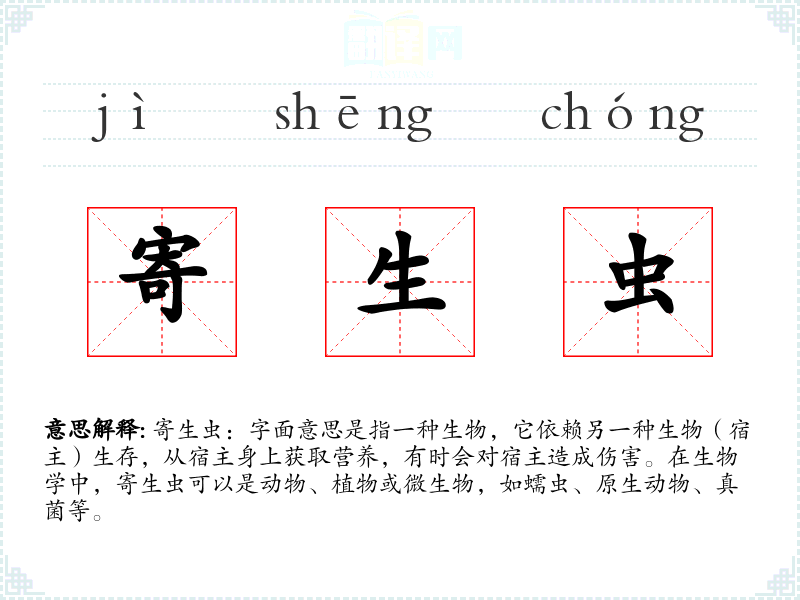 寄生虫:字面意思是指一种生物,它依赖另一种生物(宿主)生存,从宿主身上获取营养,有时会对宿主造成伤害。在生物学中,寄生虫可以是动物、植物或微生物,如蠕虫、原生动物、真菌等。