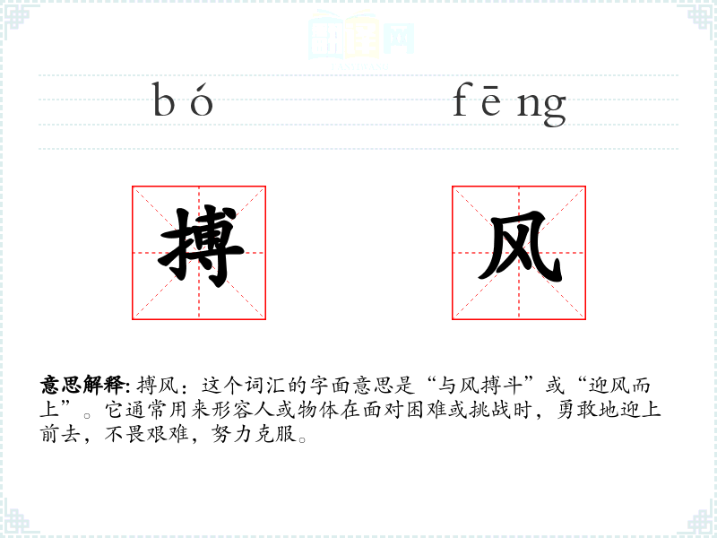 搏风:这个词汇的字面意思是“与风搏斗”或“迎风而上”。它通常用来形容人或物体在面对困难或挑战时,勇敢地迎上前去,不畏艰难,努力克服。