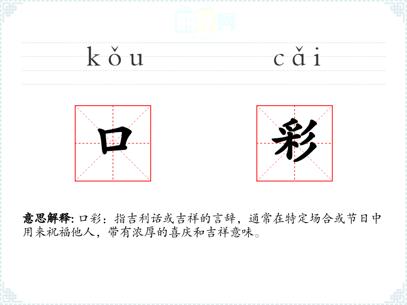 口彩:指吉利话或吉祥的言辞,通常在特定场合或节日中用来祝福他人,带有浓厚的喜庆和吉祥意味。