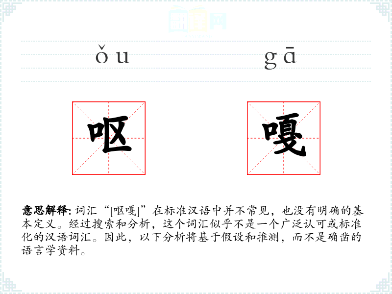 词汇“[呕嘎]”在标准汉语中并不常见,也没有明确的基本定义。经过搜索和分析,这个词汇似乎不是一个广泛认可或标准化的汉语词汇。因此,以下分析将基于假设和推测,而不是确凿的语言学资料。