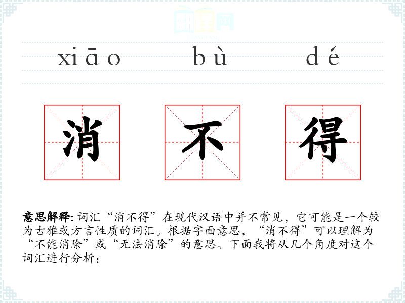 “消不得”可能源自古代汉语,其中“消”字有消除、消散的意思,“不得”表示不能或无法。随着语言的发展,这个词汇可能逐渐被更常用的表达方式所替代。