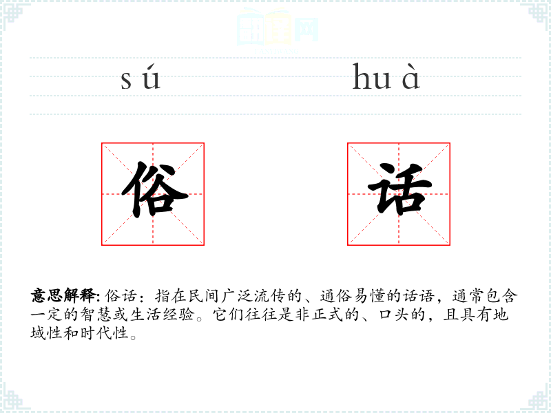 俗话:指在民间广泛流传的、通俗易懂的话语,通常包含一定的智慧或生活经验。它们往往是非正式的、口头的,且具有地域性和时代性。