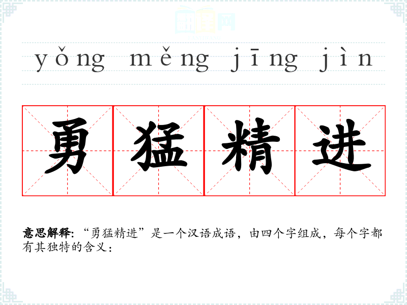 “勇猛精进”是一个汉语成语,由四个字组成,每个字都有其独特的含义: