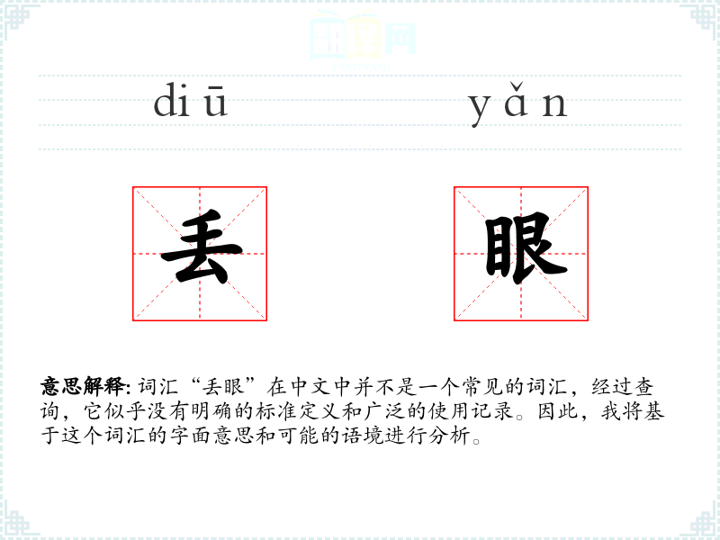 词汇“丢眼”在中文中并不是一个常见的词汇,经过查询,它似乎没有明确的标准定义和广泛的使用记录。因此,我将基于这个词汇的字面意思和可能的语境进行分析。