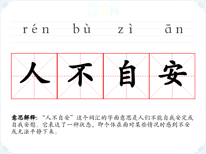 “人不自安”这个词汇的字面意思是人们不能自我安定或自我安慰。它表达了一种状态,即个体在面对某些情况时感到不安或无法平静下来。