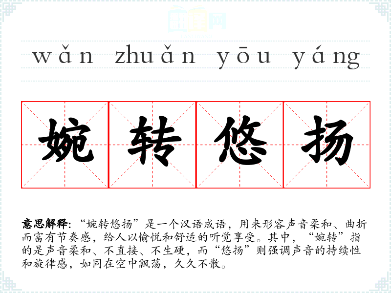 “婉转悠扬”是一个汉语成语,用来形容声音柔和、曲折而富有节奏感,给人以愉悦和舒适的听觉享受。其中,“婉转”指的是声音柔和、不直接、不生硬,而“悠扬”则强调声音的持续性和旋律感,如同在空中飘荡,久久不散。