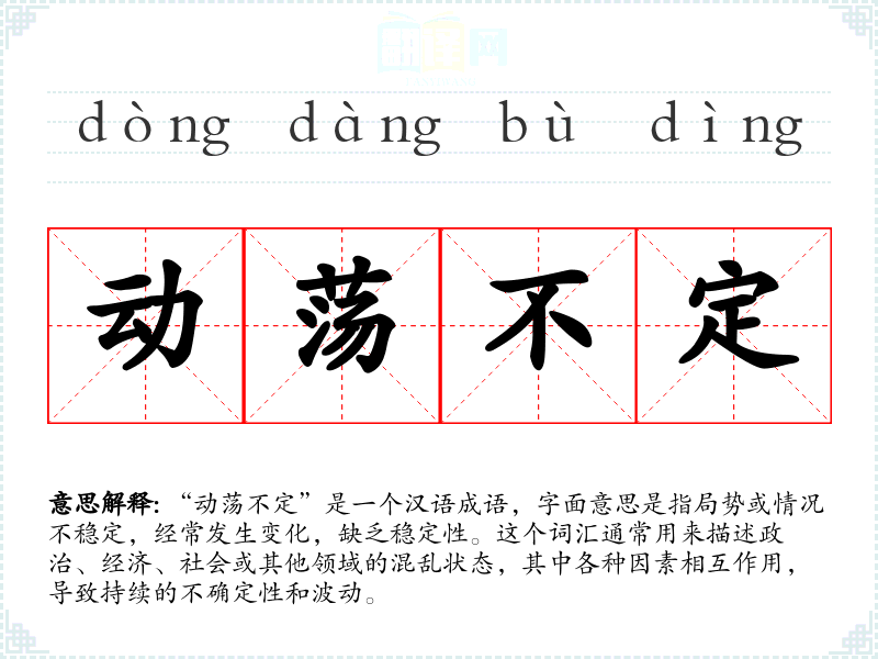 “动荡不定”是一个汉语成语,字面意思是指局势或情况不稳定,经常发生变化,缺乏稳定性。这个词汇通常用来描述政治、经济、社会或其他领域的混乱状态,其中各种因素相互作用,导致持续的不确定性和波动。