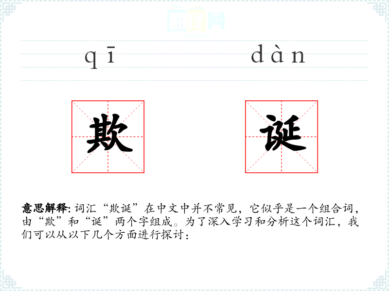 - 词源:由于“欺诞”不是一个常用词汇,其词源不明确。可能是现代汉语中由“欺”和“诞”组合而成的新词。