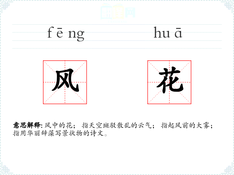 风中的花; 指天空斑驳散乱的云气; 指起风前的大雾; 指用华丽辞藻写景状物的诗文。