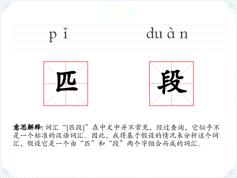 词汇“[匹段]”在中文中并不常见,经过查询,它似乎不是一个标准的汉语词汇。因此,我将基于假设的情况来分析这个词汇,假设它是一个由“匹”和“段”两个字组合而成的词汇。