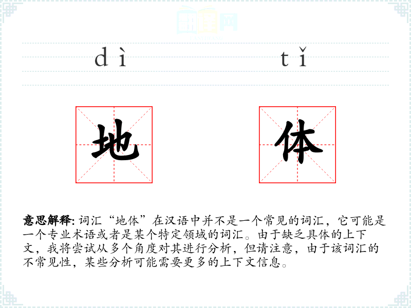 词汇“地体”在汉语中并不是一个常见的词汇,它可能是一个专业术语或者是某个特定领域的词汇。由于缺乏具体的上下文,我将尝试从多个角度对其进行分析,但请注意,由于该词汇的不常见性,某些分析可能需要更多的上下文信息。