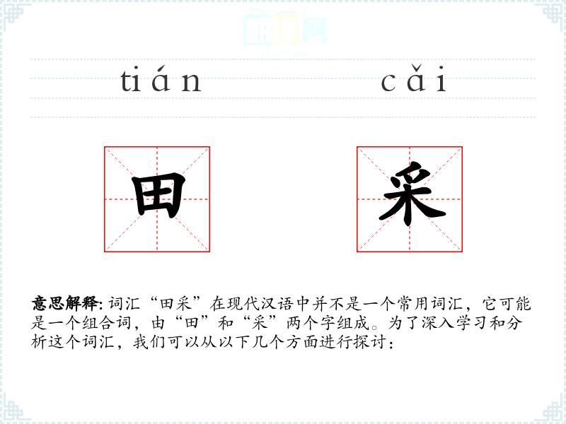 词汇“田采”在现代汉语中并不是一个常用词汇,它可能是一个组合词,由“田”和“采”两个字组成。为了深入学*和分析这个词汇,我们可以从以下几个方面进行探讨: