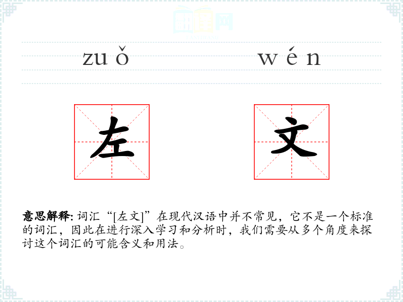综上所述,词汇“[左文]”在现代汉语中不是一个标准词汇,因此我们无法对其进行深入的学习和分析。如果这个词汇出现在某个特定的文本或语境中,我们可能需要参考该文本或语境的具体情况来理解其含义。