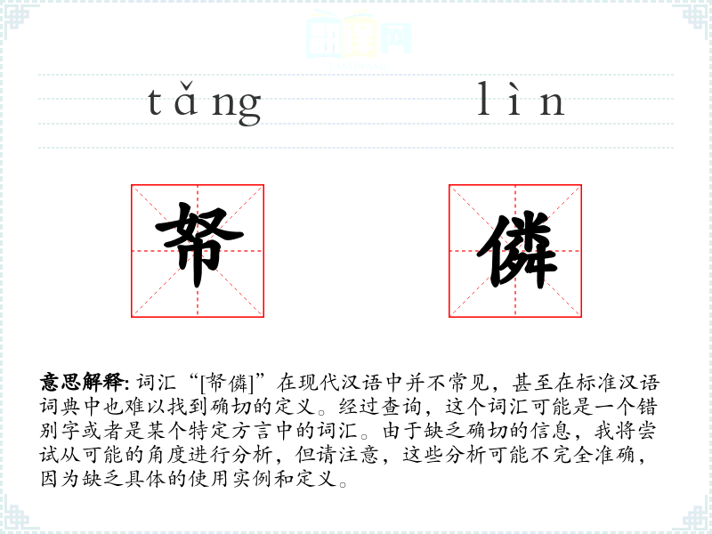 词汇“[帑僯]”在现代汉语中并不常见,甚至在标准汉语词典中也难以找到确切的定义。经过查询,这个词汇可能是一个错别字或者是某个特定方言中的词汇。由于缺乏确切的信息,我将尝试从可能的角度进行分析,但请注意,这些分析可能不完全准确,因为缺乏具体的使用实例和定义。