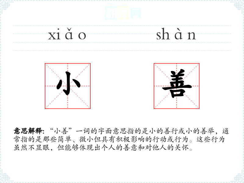 “小善”一词的字面意思指的是小的善行或小的善举,通常指的是那些简单、微小但具有积极影响的行动或行为。这些行为虽然不显眼,但能够体现出个人的善意和对他人的关怀。