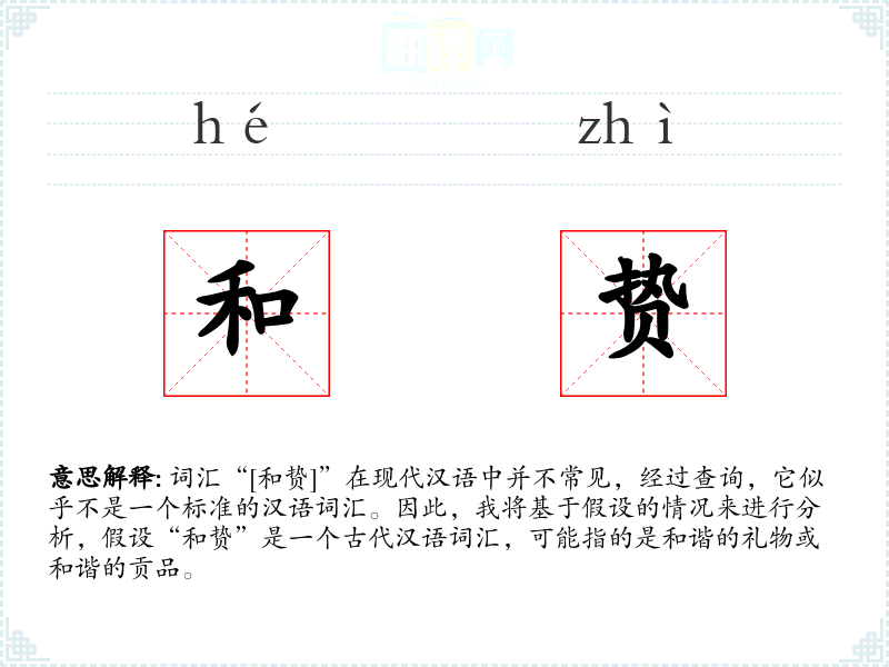 - 理解:和贽作为一个古代词汇,体现了古代礼仪文化的一部分,虽然在现代汉语中不常用,但在学习和研究古代文化时具有重要意义。