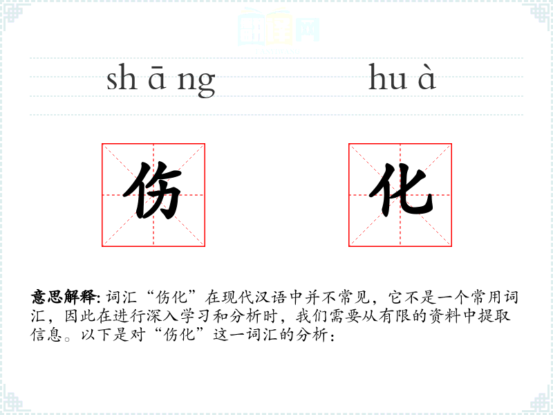 词汇“伤化”在现代汉语中并不常见,它不是一个常用词汇,因此在进行深入学*和分析时,我们需要从有限的资料中提取信息。以下是对“伤化”这一词汇的分析: