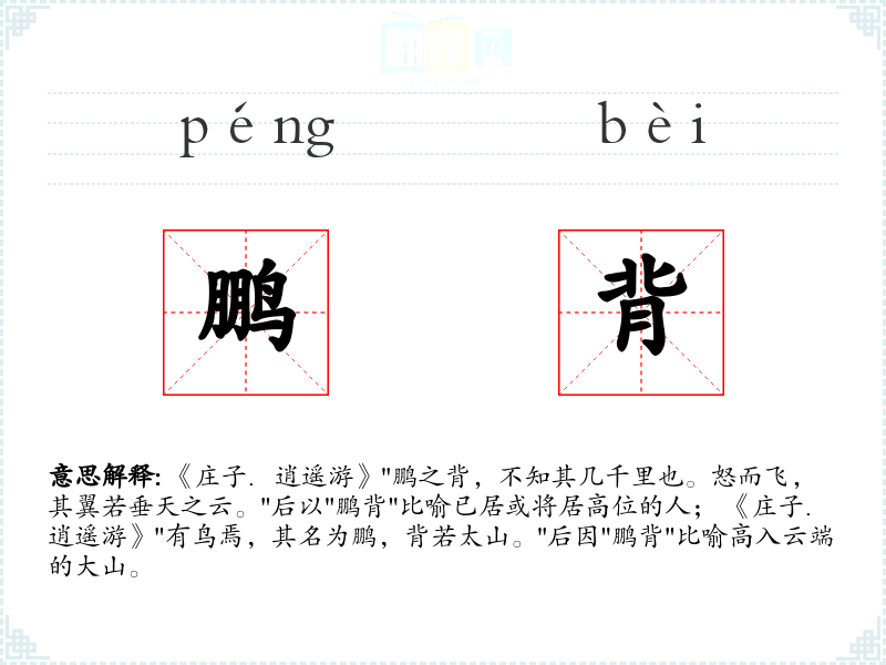 《庄子.逍遥游》"鹏之背,不知其几千里也。怒而飞,其翼若垂天之云。"后以"鹏背"比喻已居或将居高位的人; 《庄子.逍遥游》"有鸟焉,其名为鹏,背若太山。"后因"鹏背"比喻高入云端的大山。