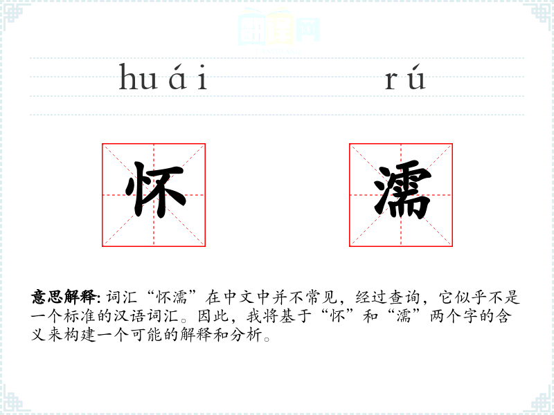 词汇“怀濡”在中文中并不常见,经过查询,它似乎不是一个标准的汉语词汇。因此,我将基于“怀”和“濡”两个字的含义来构建一个可能的解释和分析。