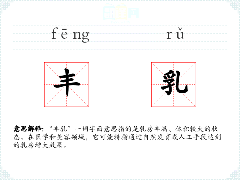 “丰乳”一词字面意思指的是乳房丰满、体积较大的状态。在医学和美容领域,它可能特指通过自然发育或人工手段达到的乳房增大效果。